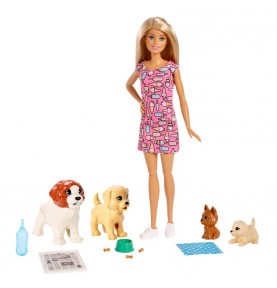 Barbie s'amuse et s'occupe ces 4 petits chiens avec leurs accessoires